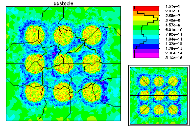 The initial mesh was adaptively refined on one processor to 2k vertices. This mesh was partitioned for 16 processors according to equal error, where the error is estimated via an a posterior error estimator. On the right the load balance is shown without element edges lined with black, and elements are colored according to size.