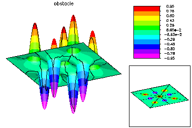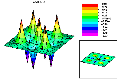 In this example, we solved a minimal surface problem in the unit square, subject to homogeneous Dirichlet boundary conditions and the constraints lwr(x,y) ≤ u(x,y) ≤ upr(x,y). The obstacles were upward and downward facing Gaussian shaped spikes, layed out in a 3 x 3 checkerboard pattern. This problem was solved using quadratic finite elements. An interior point method was used to handle the constraints. Parallel adaptive meshing using 16 processors was used to create a final global mesh with approximately 50K vertices and 187K degrees of freedom. Above is the initial coarse 9 x 9 mesh and corresponding solution.